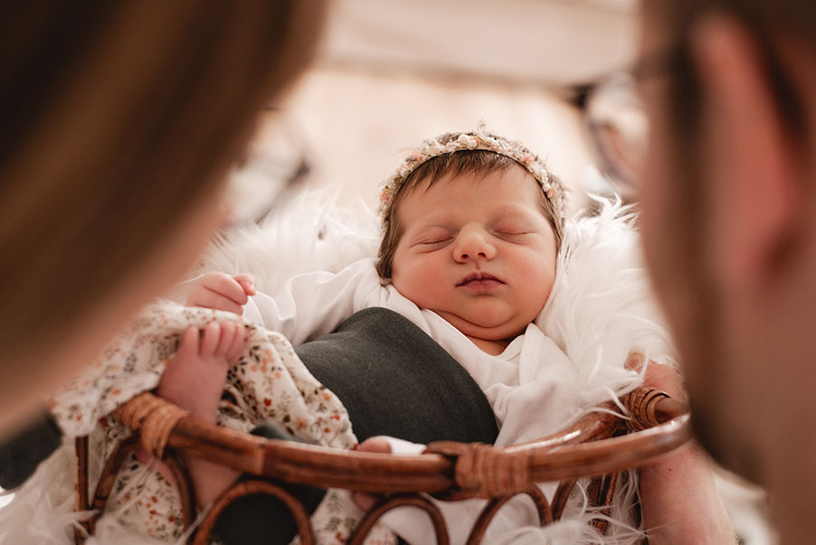 Die Shooting-Dauer variiert je nach Lust und Laune des Babys. Erfahrungsgemäß nimmt der Aufbau und die Kameraeinstellung 20 Minuten (sofern ich zu euch nach Hause komme) und die Fotografie zirka 1,5 Stunden in Anspruch. Ich halte nichts davon, über die 1,5 Stunden hinauszugehen – das ist weder für das Neugeborene, noch für euch als frisch gebackene Eltern angenehm. Ich bin aber stets bemüht, so viele verschiedene Aufnahmen wie nur möglich innerhalb dieser Zeit zu schießen. Da nur satte Babys glücklich und zufrieden sind, darfst du deinen Sprössling jederzeit füttern bzw. stillen.